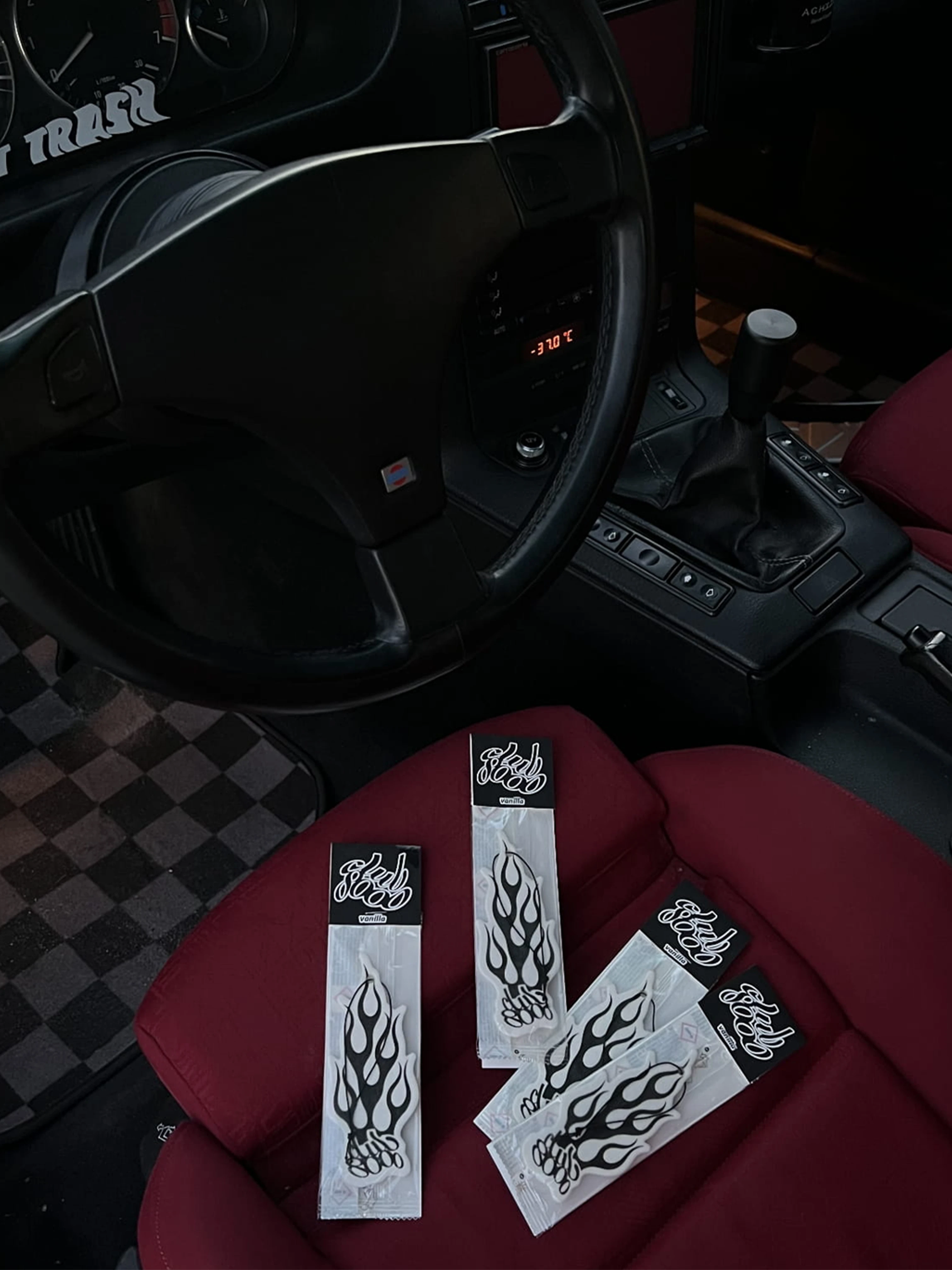 Zawieszka samochodowa o zapachu wanilii razem z wlepą w takim samym kształcie